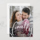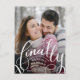 This save the date postcard is for couples who have dated or been engaged for a long time and are finally getting married. Hand lettered "finally" elegantly swoops along the bottom half of the card.
