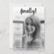 Modern graduation announcement card featuring "finally" in a thick black script handwriting along with the graduate's name and school info over your favorite vertical photo. The backside has your personal message in black over a white background. A simple design that makes your photo the main feature. This design works for a boy or a girl graduate.