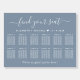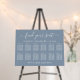Elegant dusty blue wedding seating chart foam board sign for up to 12 tables featuring "find your seat" in a chic white script with swashes, your names and wedding date joined together with a heart and "We're so glad you're here" in simple white lettering.