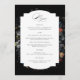 This chic menu design features an 18th century Dutch floral still life, including white, red and gold tulips and wildflowers on a black background with custom center label, complementary floral graphics and elegant flowing custom calligraphy. The back features an optional floral wreath with monogram template.