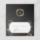 This chic place card design features an 18th century Dutch floral still life, including white, red and gold tulips and wildflowers, on a black background with custom center label, complementary floral graphics and elegant flowing custom calligraphy. The back features an optional floral wreath with monogram template.