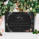 This chic RSVP design features an 18th century Dutch floral still life, including white, red and gold tulips and wildflowers, on a black background with custom center label, complementary floral graphics and elegant flowing custom calligraphy. The back features an optional floral wreath with monogram template.