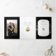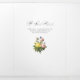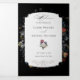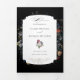 This chic tri-fold program design features an 18th century Dutch floral still life, including white, red and gold tulips and wildflowers, on a black background with custom center label, complementary floral graphics and elegant flowing custom calligraphy with photo template.