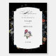 This chic welcome poster design features an 18th century Dutch floral still life, including white, red and gold tulips and wildflowers on a black background with custom center label, complementary floral graphics and elegant flowing custom calligraphy.