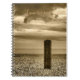 Inspirational series: An inspiring image featuring a wooden pillar on a pebble beach. Under a threatening sky, it seems to be standing with firm resolve, contemplating deep vistas and the imponderables of life.