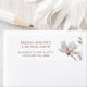 Pink white painted magnolia flowers on a white background. Use this label with full names as an addition to the casual wedding invitation with first names only.