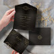 Delicate filigree frames and ornaments, textured in faux gold foil, decorate the pieces of this elegant wedding suite. A romantic serif font gives these all-in-one wedding invitations a classic, yet modern look. A textured-effect background in warm charcoal adds the finishing touch. Add details for your invite and RSVP using the provided template. Search ID871 to see the complete wedding collection and other color choices for this design.