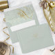 A watercolor background in shades of sage green is used to create the pieces of this beautiful wedding suite. The coordinating wedding envelope shown here also features a beautiful watercolor interior topped by an abstract of fine gold lines and glittering lighting effects. Easily add your own names and return address using the provided template. Search ID867 to see other pieces and color choices for this set.