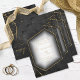 A watercolor background in shades from charcoal gray to black is topped by an abstract of fine gold lines and glittering lighting effects to create the pieces of this beautiful wedding suite. The wedding 'RSVP' card shown here also features a beautiful gradient frame to hold all your text. Easily add your own names, wedding date and event details using the provided template. Search ID867 to see other pieces and color choices for this set.