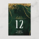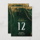 A watercolor background in shades of emerald green is topped by an abstract of fine gold lines and glittering lighting effects to create the pieces of this beautiful wedding suite. The wedding table number card shown here also features elegant calligraphy and a template to easily add your own names, wedding date and table numbers. Search ID867 to see other pieces and color choices for this set.