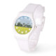 I only have one complaint. I ordered the watch with clear case and strap, and what was sent was white case and strap. I'm going to keep it because 1) it looks very nice in white, and 2) it would take too long to get a replacement made and sent in time for my occasion. Aside from the mix up with the color, the watch does look very good in white. The purple dial is actually sparkly which did not show in the online images. That was a nice surprise. If you like Swatch watches this is very similar to those. It's 33.6mm in diameter, 10.5mm thick, and 40.6mm lug to lug. Stainless steel case back says 3ATM/30m WR, so no swimming or showering or submerging this one. If you like Woodstock, this is a great choice.
