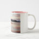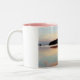Beautiful pink, teal, and turquoise Finnish July sunset over island-strewn lake on a white mug with a light pink interior. Photo copyright 2006.