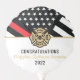 This design features a firemen's flag with black and white stripes, and a thin red line stripe as well. "Congratulations" and a fireman's badge sits above the name of the graduating firefighter. This design also works great for retiring firefighters, lieutenants, or chiefs. Celebrate in style!