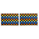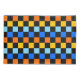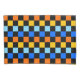 A vibrant checkerboard pattern featuring alternating rows of orange, yellow, light blue, and blue squares against a black background. The design is bold and energetic.