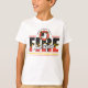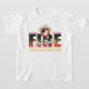 Fire Fighter with axe in fire fighter shield with flaming FIRE and RESCUE text! Proud, Strong and Brave upper text with Motivated, Dedicated and Fearless below! Great fire fighting shirts and gifts!