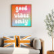 A groovy retro "good vibes only" typography design on a vivid orange, hot pink and aqua blue gradient on a poster.