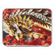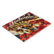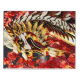 A menacing fire breathing dragon with vibrant gold scales, showcasing its terrifyingly large teeth, realistic shading and textures, high detail, close-up angle, dark background with highlights, digital painting 4k resolution, cinematic lighting, fear-inducing atmosphere.On this artificial intelligence photo.close up of dradon head with red tree leaves behind him.