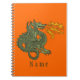 A vintage woodcut of a fire breathing dragon is colored green. Background is orange. Your name or phrase in green below.