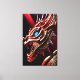 A menacing fire breathing dragon with vibrant red and gold scale, with blue eyes showcasing its terrifyingly large gold teeth, realistic shading and textures, high detail, close-up angle, dark background with highlights, digital painting 4k resolution, cinematic lighting, fear-inducing atmosphere.On this artificial intelligence photo.