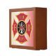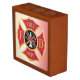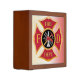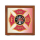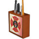 This custom desk pen and pencil holder is decorated on one side with the Firefighter Chief gold 5 bugle medallion and on the other with the firefighter Maltese cross.