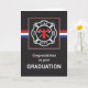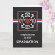 Graduation from Fire Department Academy card for man or woman. Congratulate them on their great achievement. This card shows a fire fighter’s emblem shows a fire hydrant and 2 axes in red. The white message stands out against the black background with a patriotic red, white and blue stripe center behind the emblem.