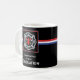 Graduation from Fire Department Academy gift mug for man or woman. Congratulate them on their great achievement. This mug shows a fire fighter’s emblem shows a fire hydrant and 2 axes in red. The white message stands out against the black background with a patriotic red, white and blue stripe center behind the emblem.