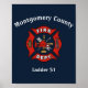 Stylish poster for firefighters and their families, features red generic fire department logo on dark blue background. Customize with city or county department details or firefighter name in modern white font
