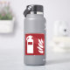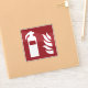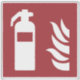 Fire extinguisher and flame icon on red background.