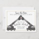 Fireman, bride and groom on ladder trucks. Save the date with this unique fire truck, fire fighter announcement with photo on back.