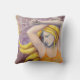 A pillow with my mixed media painting Fire Goddess Dancing on it. The painting is a close-up of a woman dancing with poi fans.