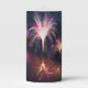 Five sprays of fireworks reflected in the dark water beneath - a bursts of pale blue, rose pink, bright gold, and mint green, and in the center sparkles of all the colors of the rainbow.