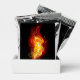 Bright peacock feather made of fire and flame on black background.