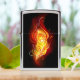 Bright peacock feather made of fire and flame on black background.