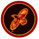 A glowing, fiery raven (Corvus corax) soars with wings spread on a dark background.