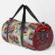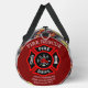 A gray duffle bag is covered in a vibrant pattern of red fire trucks, complete with ladders and fire axes, set against a light-colored ground with yellow splashes. A prominent side pocket, adorned with a red fire department emblem, proudly displays "FIRE RESCUE," "JENNY SAMSMITH," "FIRE DEPARTMENT," and "Vancouver B.C.," creating a personalized and functional item for a firefighter. Personalize with your name and department home town and more. monogram