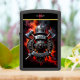 This personalized pocket lighter features an intricate, mechanical-style firefighter emblem set against a dramatic backdrop of swirling red and orange flames and dark smoke. The central design showcases a metallic Maltese cross layered with crossed fire axes and a detailed fire helmet at the top. Banners reading FIRE and RESCUE are integrated into the industrial, 3D-effect shield. At the top of the matte black case, the embossed text Smithright is rendered in an elegant white cursive script above a bold red letter W. A thin gold horizontal line separates the personalization area from the main graphic. The dark metal casing provides a sleek decorative border for this powerful heroic illustration.