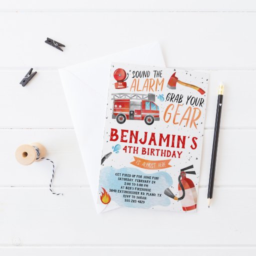 Sound the alarm and grab your gear, your little fireman's birthday is here! Invite your friends to celebrate with this super hot Fire Truck birthday invitation!