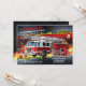 This unique invitation features a real fire truck and fireman gear, against a fiery background.