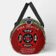 This duffle bag features a captivating pattern of red fire trucks navigating a winding road through a lush green forest. The vibrant scenery with tall pine trees and a subtle mountain backdrop creates an adventurous feel. A prominent side pocket with a fire department emblem is personalized with "FIRE RESCUE," "JENNY SAMSMITH," and "Vancouver B.C.," making it a unique gift for a firefighter. Personalize with your name and department home town and more. monogram