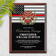 Personalized firefighter commendation award, featuring the classic thin red line firefighter flag, and the Maltese cross.