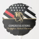 This design features a firemen's flag with black and white stripes, and a thin red line stripe as well. "Congratulations" and a fireman's helmet sits above the name of the graduating firefighter. This design also works great for retiring firefighters, lieutenants, or chiefs. Celebrate in style!