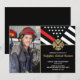 This design features a firemen's flag with black and white stripes, and a thin red line stripe as well. A fireman's badge sits above all of the party details for the graduating firefighter, which is next to a picture of the new fire academy graduate. This design also works great for a retiring firefighter, lieutenant, or chief's retirement party.