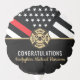 This design features a firemen's flag with black and white stripes, and a thin red line stripe as well. "Congratulations" and a fireman's badge sits above the name of the graduating firefighter. This design also works great for retiring firefighters, lieutenants, or chiefs. Celebrate in style!