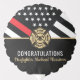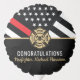 This design features a firemen's flag with black and white stripes, and a thin red line stripe as well. "Congratulations" and a fireman's badge sits above the name of the graduating firefighter. This design also works great for retiring firefighters, lieutenants, or chiefs. Celebrate in style!