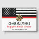 This design features a firemen's flag with black and white stripes, and a thin red line stripe as well. "Congratulations" and a fireman's badge sits above the name of the graduating firefighter. This design also works great for retiring firefighters, lieutenants, or chiefs. Celebrate in style!
