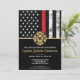 This design features a firemen's flag with black and white stripes, and a thin red line stripe as well. A fireman's badge sits above all of the party details for the retiring firefighter, lieutenant, or chief's retirement party. The invitations can also be customized for a retiring firefighter.