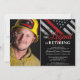This design features a fireman's flag with black and white stripes, and a thin red line stripe as well. "The Legend is Retiring" text sits above all of the party details for the retiring firefighter, lieutenant, or chief. Customize this design even further with a photo of the retiring firefighter.