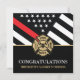 This design features a firemen's flag with black and white stripes, and a thin red line stripe as well. "Congratulations" and a fireman's badge sits above the name of the graduating firefighter. This design also works great for retiring firefighters, lieutenants, or chiefs. Celebrate in style!