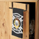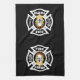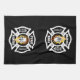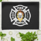 Firefighter flaming skull sets flames against fire dept maltese cross logo symbol of firefighting and tough enough to get the job done.