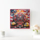This decorative wall clock showcases a powerful firefighter emblem, fire truck, and essential gear, all set against a patriotic American flag. It's a heroic tribute to emergency services and first responders, symbolizing courage and dedication. The vivid colors and iconic imagery make this timepiece a meaningful piece of wall decor, perfect for celebrating fire department pride.